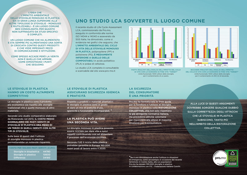 In realtà, per definizione, la sostenibilità ambientale di un prodotto si misura in termini di impatto ambientale durante l’intero ciclo di vita, non solo prendendo in considerazione il fine vita o la tipologia del materiale di partenza. Proprio in questa logica, Pro.mo ha commissionato all’Università di Trento uno studio che misura l’impatto di gran parte delle stoviglie oggi sul mercato, divise per categoria (piatti e bicchieri) e materiale (PS, PP, PLA, polpa di cellulosa, cartoncino, vetro e ceramica). Lo studio, asseverato da SGS, è una completa e dettagliata fonte di dati che mostrano la reale sostenibilità ambientale dei prodotti in esame…